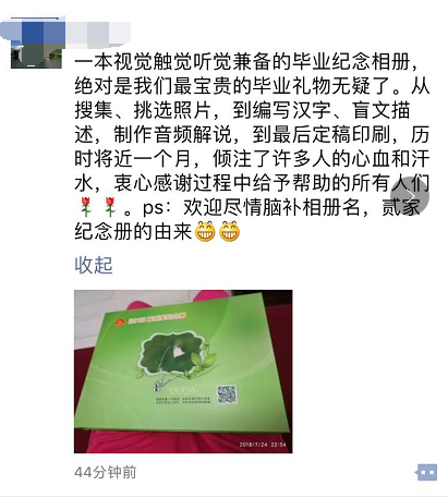 感謝所有為“盲文畢業(yè)紀(jì)念冊(cè)”做出奉獻(xiàn)的人,因?yàn)槟銈?,世界更美麗。掃描封面二維碼,聆聽2018屆貳家畢業(yè)班同學(xué)的校園故事,不知不覺,熱淚盈眶,感動(dòng)之余,我明白了“讓印刷走進(jìn)千家萬(wàn)戶,為幸福生活添色加彩”的真實(shí)含義。